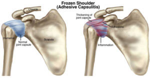 When adhesive Capsulitis occurs, an inflammatory process takes place which causes the soft tissues within the shoulder to become infiltrated with scar tissue .this scar tissue organizes itself to from very tough bands called adhesions that restrict motion.